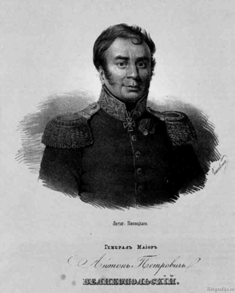 Лишенный возм-сти, вследствие контузии, принимать участие в боев. действиях, В. был назначен комендантом г. Юрбурга, с поручением устроить госпиталь на 2400 ч. и собрать отставших от корпуса людей. Исполнив поручение и получив облегчение в болезни, В. отправился в Кенигсберг, где принял нач-во над частью Петербург. и Новгород. ополчений, с коими отправился под Данциг и вступил в отряд генерала Левиза; затем В. отозван в гл. армию в Богемию и, стоя при Барклай де Толли, участвовал в Лейпциг. битве, причем был серьезно контужен в ногу. В ноябр. 1813 г. В. был зачислен по кав-рии без должности, а 7 июля 1828 г. был назначен презусом комиссии воен. суда при СПб. ордонанс-гаузе; в этом звании он умер в янв. 1830 г. {Воен. энц.} Великопольский, Антон Петрович ген.-майор, презус СПб ордонансгауза; р. 1766 г., † 1830 г. 27 янв. 63-х лет. {Половцов}